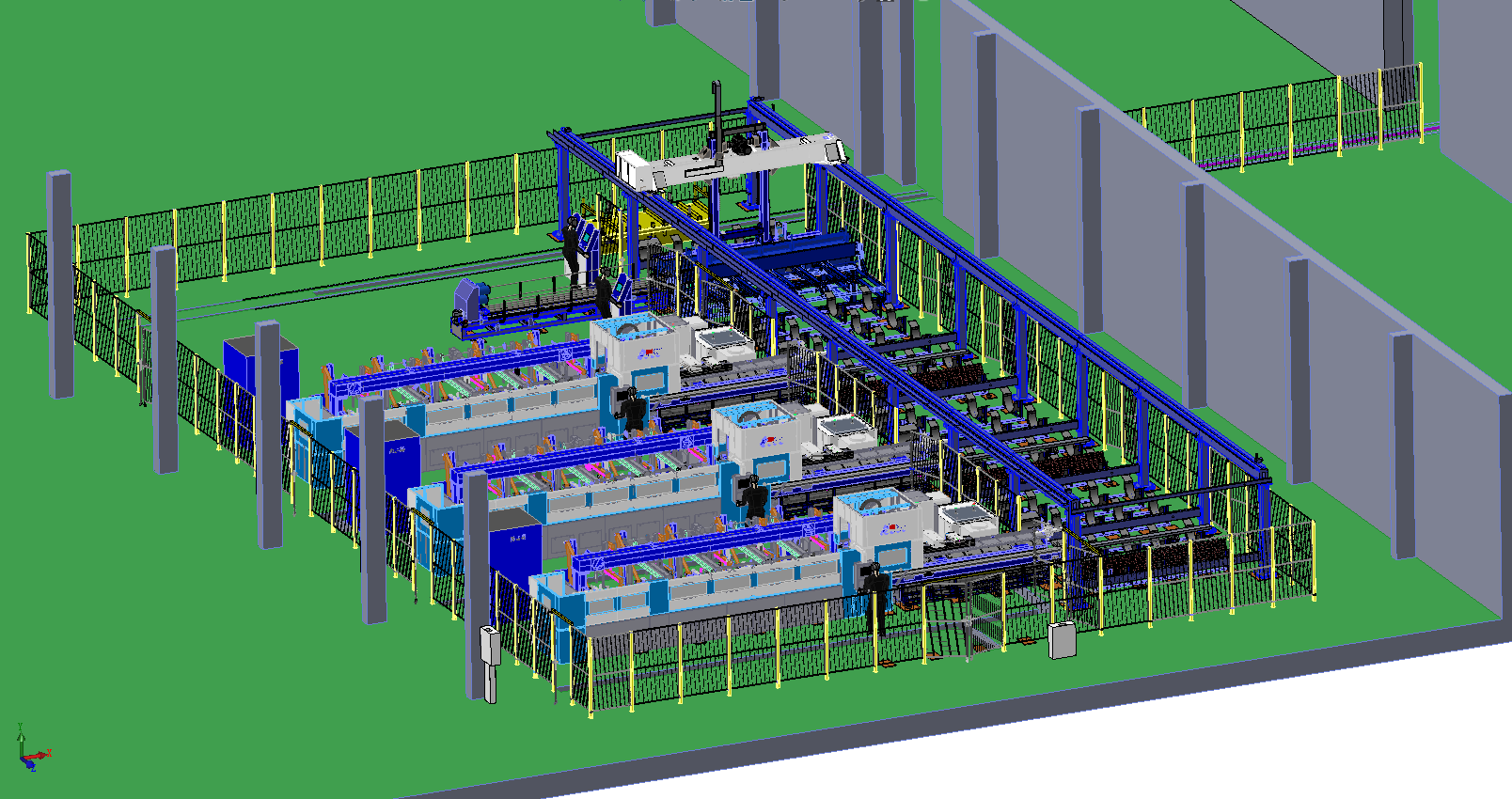 通過在庫房至激光加工車間之間建立一條自動傳輸線,實現(xiàn)成捆原材料及成品往返傳輸,實現(xiàn)了自動接收、智能分配、調(diào)度任務(wù),柔性加工生產(chǎn),高速高精、安全穩(wěn)定運行、高質(zhì)量智能加工。該產(chǎn)線由中央調(diào)度系統(tǒng)自動分配任務(wù),三臺全自動激光切管機對指派的任務(wù)實現(xiàn)全自動上料、下料及激光加工;自動分揀系統(tǒng)對加工彈架進行自動分揀、計數(shù),到達指定數(shù)量后,全自動搬運系統(tǒng)進行自動搬運至內(nèi)壁處理系統(tǒng);內(nèi)壁自動處理系統(tǒng)對彈架進行自動分料、上料、內(nèi)壁拋光、自動下料,完成拋光的彈架通過RGV傳輸線轉(zhuǎn)運至焊接、裝配車間進行焊接、裝配、打包,彈架成品經(jīng)RGV傳輸線返回庫房;生產(chǎn)線配以封閉安全防護系統(tǒng)及聲光報警系統(tǒng)。
