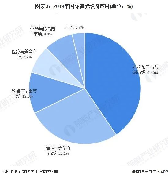 國(guó)際激光設(shè)備應(yīng)用較為多元化,包括材料加工與光刻市場(chǎng)、通信與光儲(chǔ)存市場(chǎng)、科研與軍事市場(chǎng)、醫(yī)療與美容市場(chǎng)、儀器與傳感器市場(chǎng)等,其中,材料加工與光刻市場(chǎng)占比最高,達(dá)40.6%;其次為通信與光儲(chǔ)存市場(chǎng),占比為27.1%。