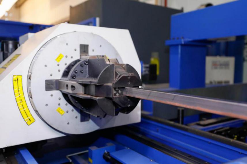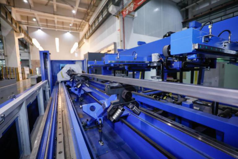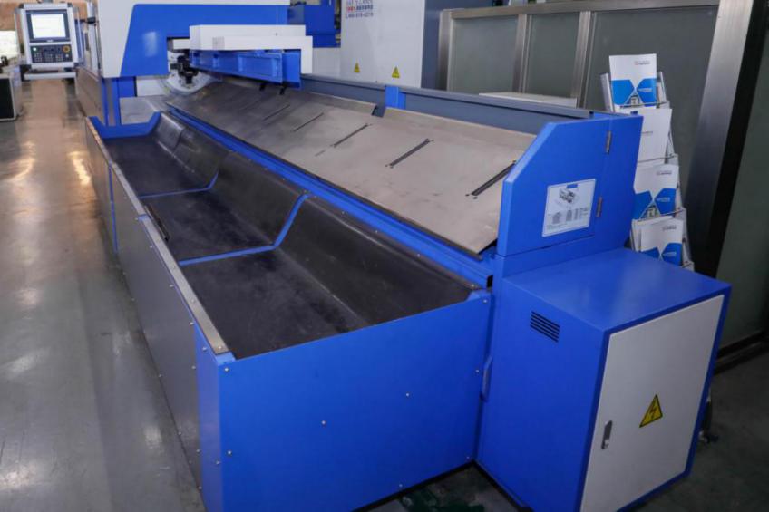 改進(jìn)后的夾持系統(tǒng),由兩組滑板、數(shù)控旋轉(zhuǎn)臺(tái)和四爪對(duì)抓自定心氣動(dòng)夾頭組成,其中一組移動(dòng)(X軸),另一組固定在床身上。通過大族智控?cái)?shù)控系統(tǒng)控制交流伺服電機(jī)驅(qū)動(dòng)送料夾頭,實(shí)現(xiàn)X軸方向的快速移動(dòng)和送料,完成上料、切割送料。四爪自定心對(duì)抓氣動(dòng)夾頭采用氣動(dòng)夾緊。兩個(gè)夾爪聯(lián)動(dòng),實(shí)現(xiàn)自定心功能;兩對(duì)對(duì)抓卡爪單獨(dú)運(yùn)動(dòng),實(shí)現(xiàn)對(duì)不同形狀管材的自定心夾緊。改進(jìn)后的夾緊氣缸不再隨夾頭旋轉(zhuǎn),無密封漏氣風(fēng)險(xiǎn),最大夾緊重量提高到200公斤,夾緊后有反饋信號(hào),且可以自動(dòng)檢測(cè)管材規(guī)格,并與程序進(jìn)行比較,判斷是否上錯(cuò)管材,實(shí)現(xiàn)對(duì)不同長(zhǎng)度,不同形狀管材的定位、夾緊和比對(duì)。