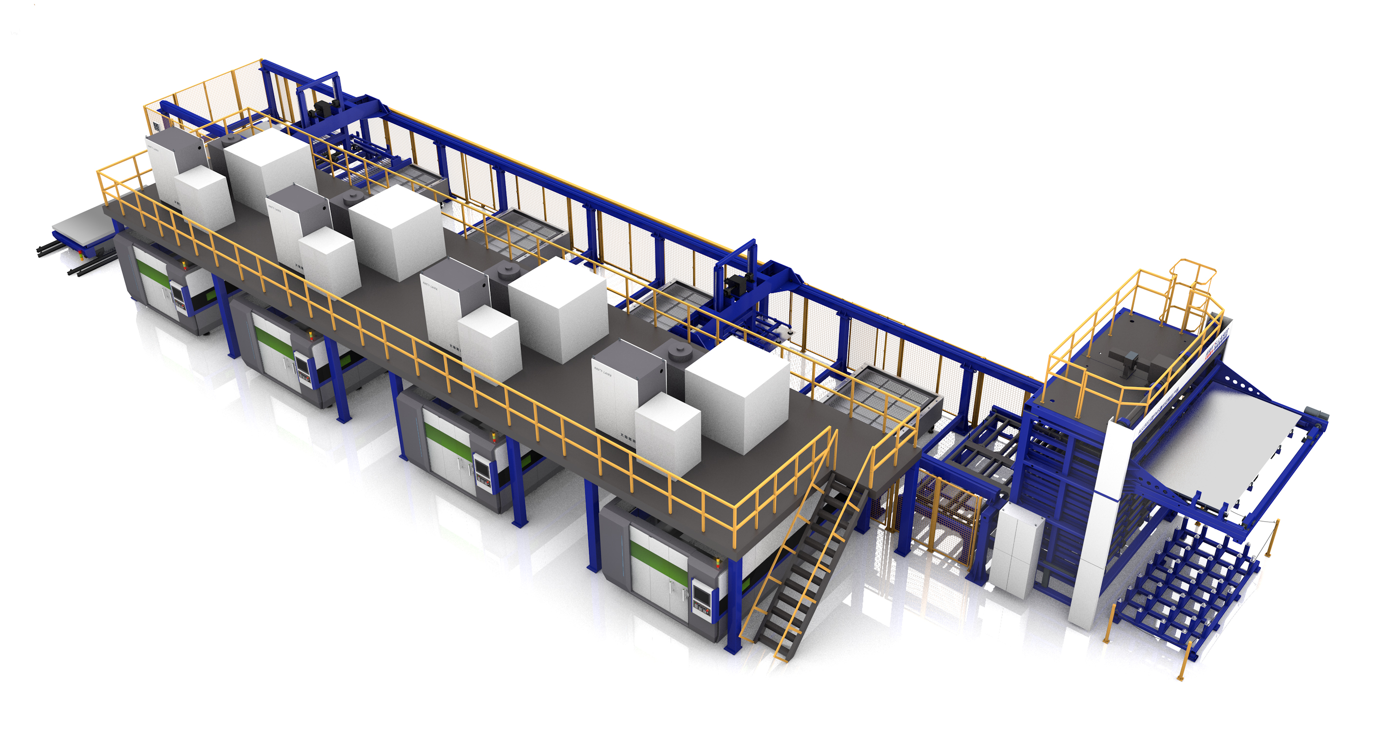 FMS激光切割柔性生產線主要由計算機CAD /CAM編程系統、10層立體倉庫、物流系統、自動上下料系統、多臺平面激光切割機系統、成品分揀臺系統組成,可以實現從上料到切割再到分揀成品的全過程無人化自動操作,切實滿足了用戶高效率、高智能、高柔性、低成本的生產要求。