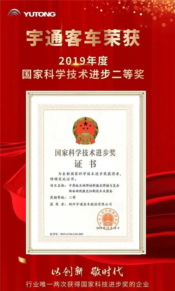 日前,國務(wù)院正式頒發(fā)2019年國家科學(xué)技術(shù)進步獎證書,鄭州宇通客車股份有限公司《中厚板及難焊材料激光焊接與復(fù)雜曲面曲線激光切割技術(shù)及裝備》項目榮獲國家科技進步獎二等獎。