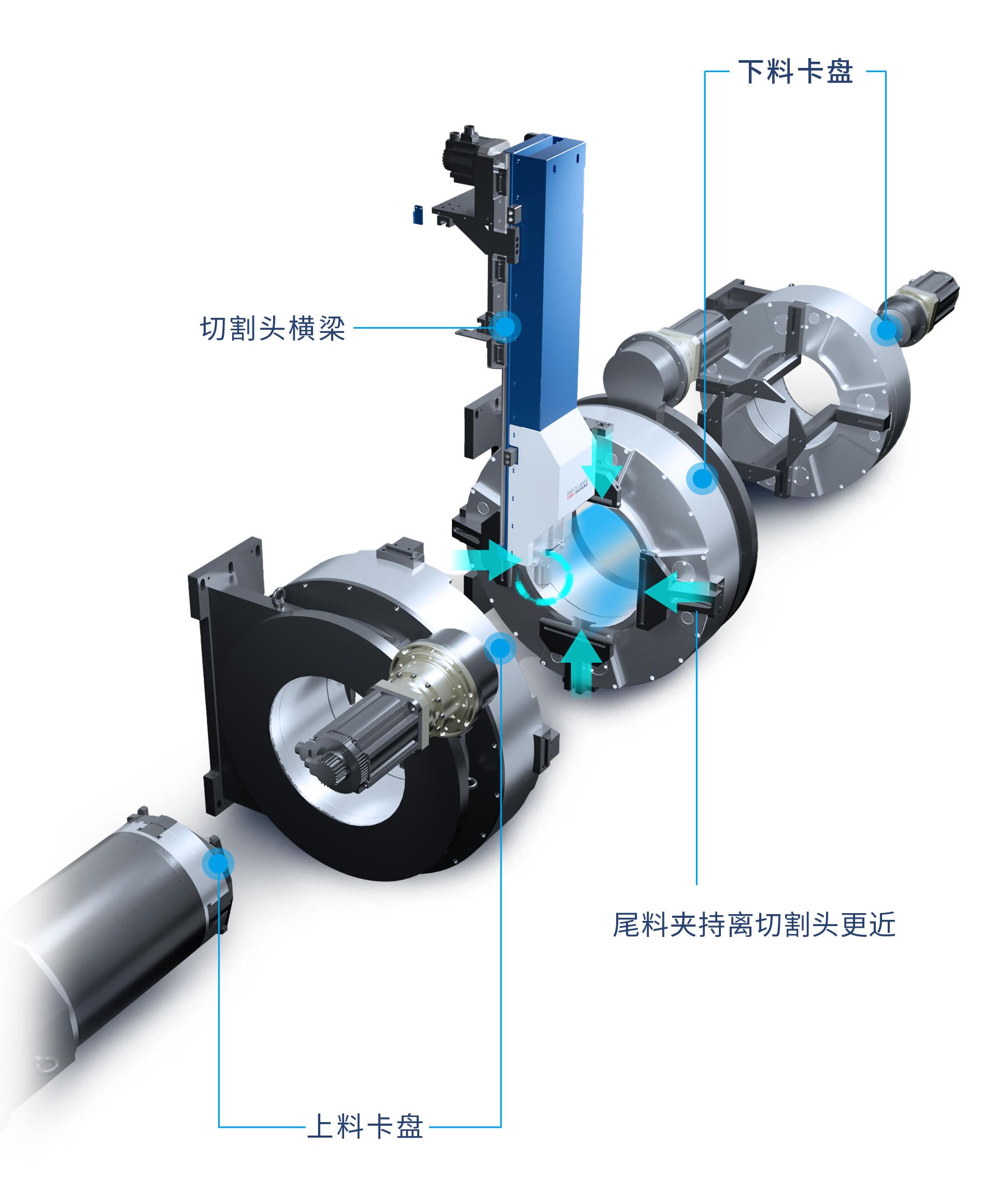 四卡盤(pán)同軸夾管,管材夾持端離切割頭更近,